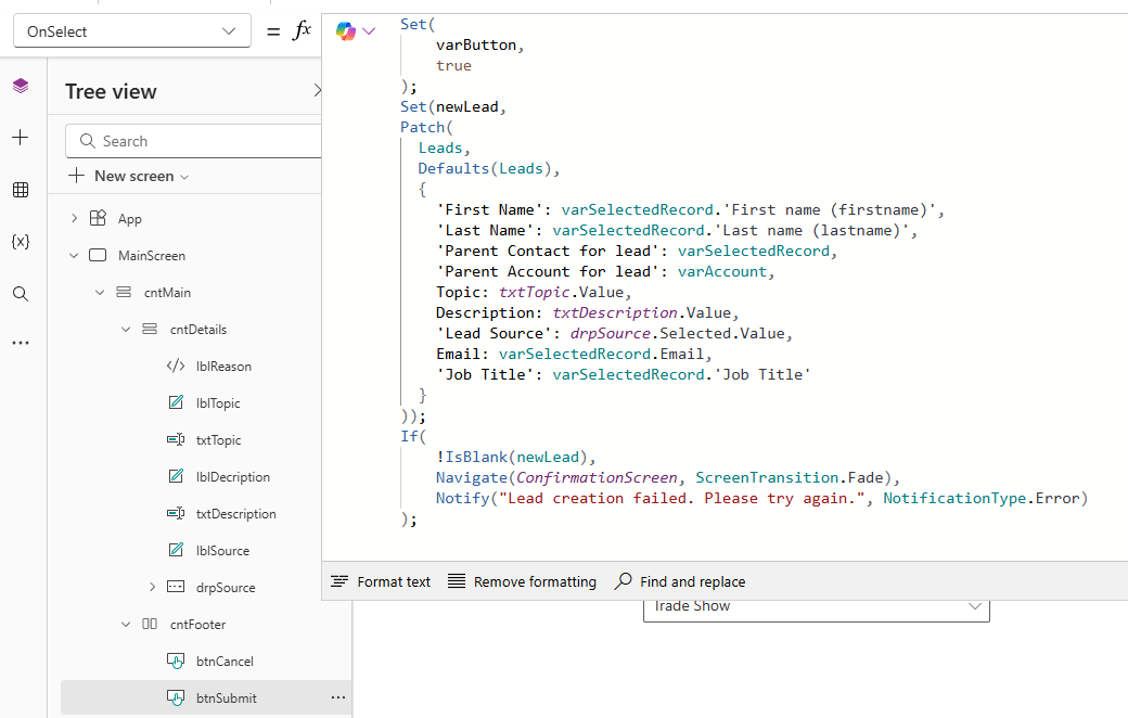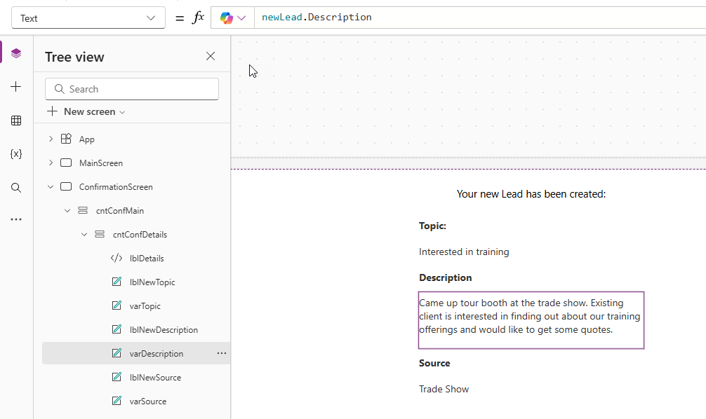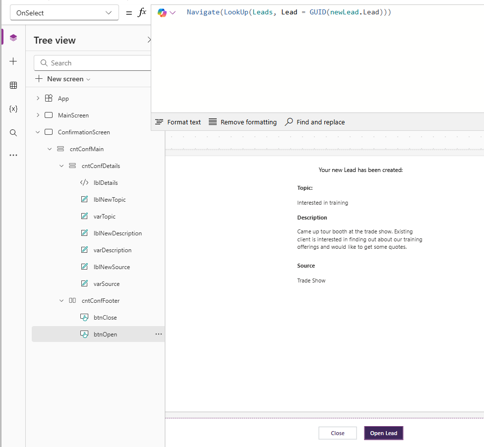 LookUp(Leads, Lead = GUID(newLead.Lead))- Searches the Leads table for the record where the Lead ID matches the one you just created.
