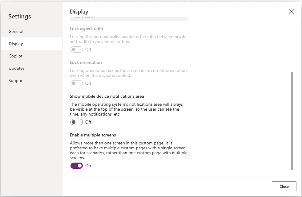 To add extra screens, click on the Settings from the top of your custom page, then scroll to the bottom of the Display settings. From here, click to enable multiple screens.