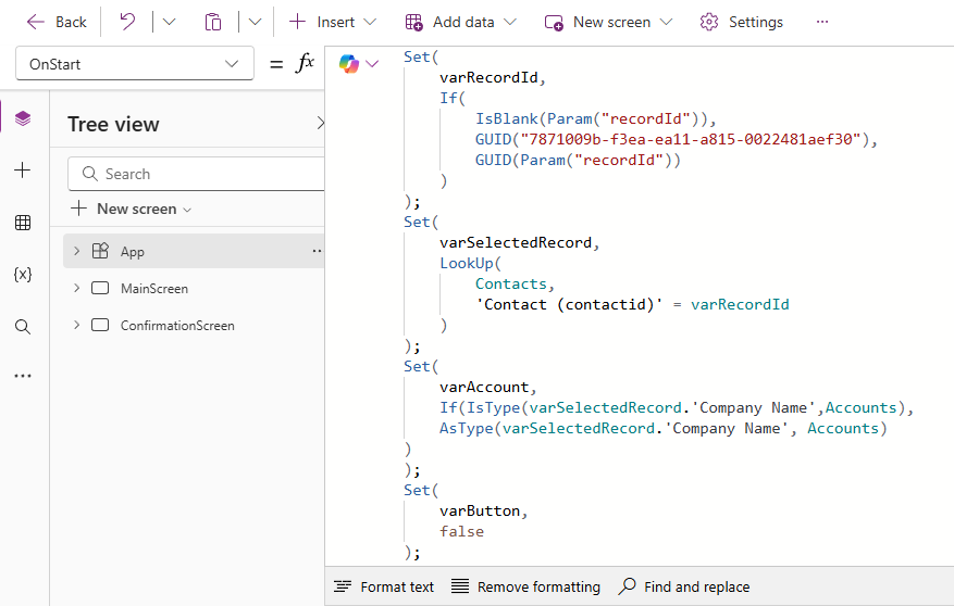 For this example, someone in sales or account management can go to a Contact and click a button to create a Lead. It’s kind of going backwards, but this allows you to review the requirement from the Contact, and then still go through the process of qualifying or disqualifying the Lead, but keeping it all linked to the existing Contact and their Account (if applicable). The App OnStart looks something like this. We are getting the ID of the Contact (or using the test GUID when editing the custom page), then using the lookup function to set varSelectedRecord as the Contact. Next we can set varAccount as a variable containing the related Account record from the Company Name field on the Account.
