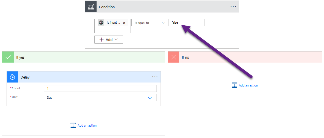 Then we have a condition. If the output is false (meaning it is NOT a working day) we can add in a delay of 1 day in the Yes path so that it checks again the next day to see if it is a working day.