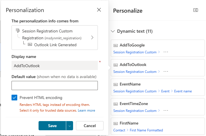 Alright! Once you’ve added the formula, you should be able to save it (wait a moment if you don’t see the Save button), then add it to your Session Registration (or Event Registration) form so you can see it. You are now able to include it in an Email. I have a custom Session Registration trigger, which ideally you also have if you are sending out emails specific to Session Registrations. You can also access Session information via out of the box triggers using Lists. Here you can see I am adding my new field dynamically which I am putting on a button. There is a feature that allows you to prevent HTML encoding. Make sure you select this to turn it on. That means it doesn’t try and change the information and encoding things within the value our formula has set. We don’t want the email trying to change anything!