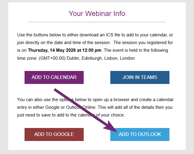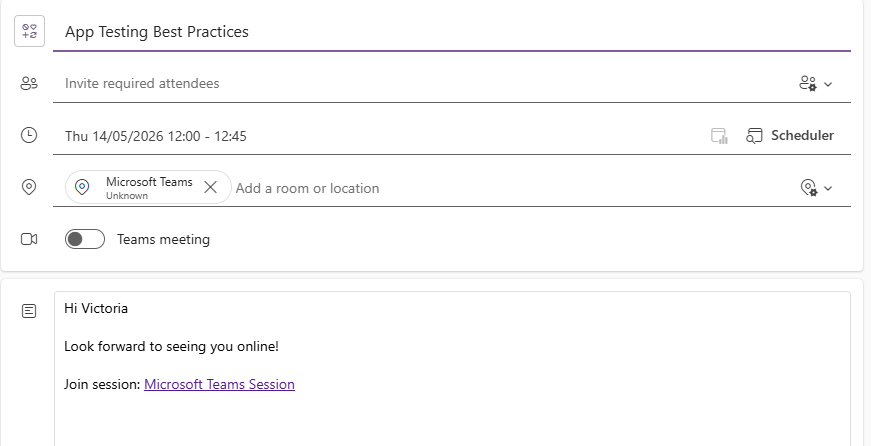 Clicking on the Add To Outlook button opens up a browser window with all of the information we passed through in the URL for our custom formula field. The name of the session, the date and time, location of Microsoft Teams, contacts name and a message along with their specific unique link to join the session.