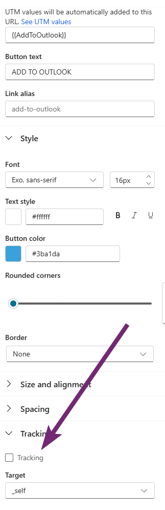 Again, we do not want the email messing with our link and trying to add in additional parameters, so make sure on your button or wherever you are adding this link, you scroll to the bottom, expand tracking, and untick the tracking box that is always on by default. You won’t know who has clicked on it, but I think having this option is worth it, and we just have to sacrifice stats on that specific button link.