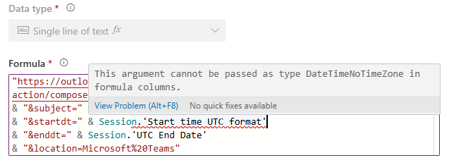 We are going to end up with a custom formula field. If you want a bit of an overview of formula fields because you’ve never used them before, check out one of my other blogs here. The structure begins with a base URL. We can then pass through a series of parameters in to the URL to set the Subject, Start Date/Time, End Date/Time, Location (Microsoft Teams), and the body of the appointment including a unique link to join the webinar in Microsoft Teams. Before creating the new field, we need to do something to get the Start/End date and time in an ISO 8601 combined date and time string in UTC. It will need to be a text string rather than a date, so we need to do some formulas on the session (or event) to set the UTC values correctly. If we don’t and just try and use the out of the box start/end time in UTC format field, we will get errors due to time zone issues.