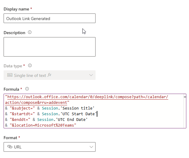 First, props to my very good friend Amey Holden. She and I both have created unique Join In Teams links for Event Registrations over the years, but she just recently wrote about using a Formula field to do it rather than generating via Power Automate. This is much easier so check it out! I had been looking at using something called a deep link which can be used to direct someone to specific content with values populated such as an email, but more important can be used to create a link for an appointment in Outlook. The approach in this email assumes using Microsoft Teams Webinar for the Event, and in my example I am adding a link to add a Session Registration rather than Event Registration. You can easily modify this approach by adding your new field to the Event Registration if that is what you typically only work with.