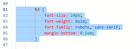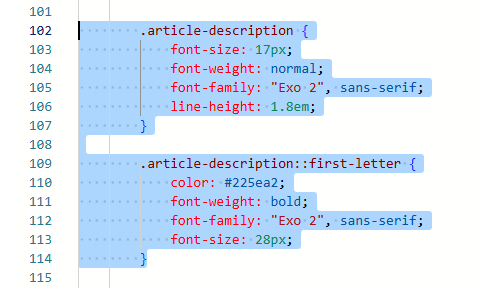 For this, I am setting the main font styling, but then I also want to style the first letter in this section to be a different colour and larger than the rest of the letters.