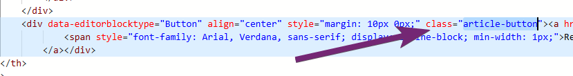 Again, I am going to create a custom button class that I can add so that any other buttons I might want to add will use the standard button class in the CSS. So I find the button I added, then either adjust any existing class, or add in class=”article-button”.