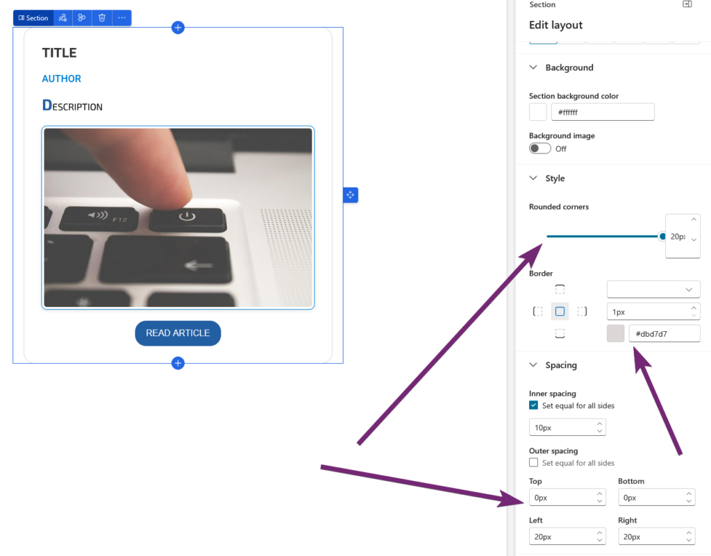 I’ve also added a border to the style of the section with rounded corners, 1 px with a grey colour and then set some spacing either side to give it the card effect.