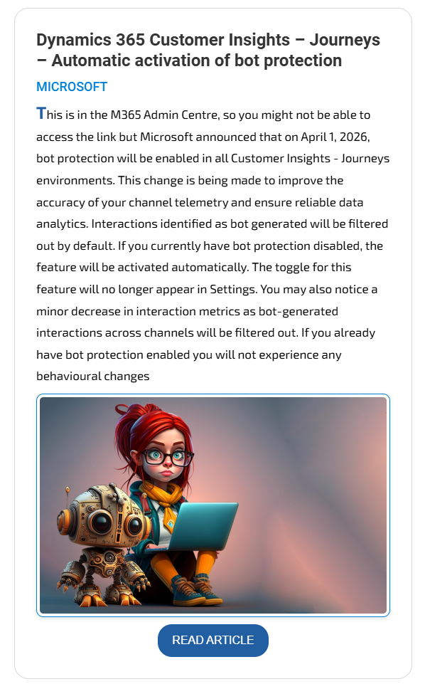 Who like things to make your life easier? Who hates doing the same thing over and over again? Well, me, on both counts. Each week I put together the D365 Marketing Weekly newsletter and the email that goes along with it. Each article has a title, author, description, image and a button with a link. I’ve styled it to be a nice little content card. If you have a similar requirement for a reusable content card for your own newsletter, I hope this post will help. It does mean jumping in to a bit of custom HTML, so be brave and follow along!