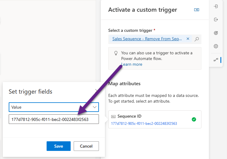 Once your flow is ready, you can use the trigger in a couple of ways. First would be to add in as a step within a journey and ‘Activate a custom trigger’ and select the custom trigger. You will need to map the sequence id attribute as a value.