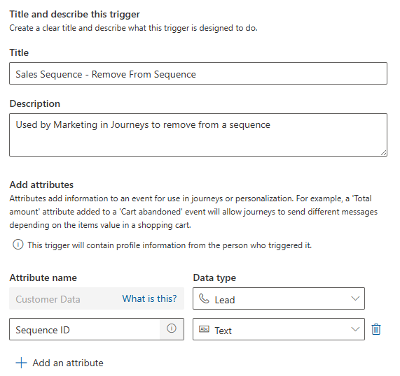 We just need to set the customer type (Lead or Contact) and then add in a second attribute called Sequence ID that is a text field. Save and publish the trigger. Note that you would need two triggers if you add both Leads and Contacts to segments and journeys, one for each audience member type.