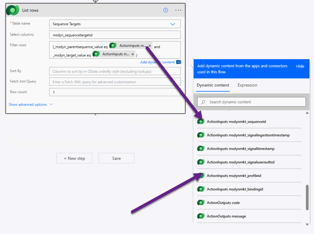 Add a List rows action step from the Dataverse connector. When we use this trigger within a Journey, we will pass through the ID of the sequence that we want to take someone out of. We will then get that from the start of our flow. Use msdyn_sequencetargetid in the select columns and then filter the rows. To do this we need to pass through the sequence id from the values from the start of the flow, and then the profile id also. This means we are finding the instance for a specific person going through a specific sequence.