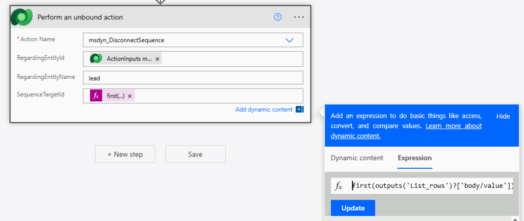 Now we need to use the Perform an unbound action from the Dataverse connector. From the action name list, pick msdyn_DisconnectSequence. The RegardingEntityId needs to be the same profileid option from the list of ActionInputs. Then the RegardingEntityName should either be lead or contact depending on what you set the trigger up for. The SequenceTargetId needs to be the first record found from the List rows step above. You can use the expression below, just rename the List_rows part if you renamed your List rows step.