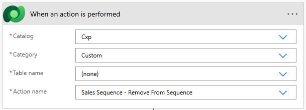Now go in to Power Automate and add a flow that is triggered with the ‘When an action is performed’ option from the Dataverse trigger. Select Cxp as the Catalog, Custom as the Category, none as the Table name. In the Action name drop down, find the new trigger you just created.