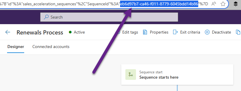 If you are not sure about where to find the sequence id, there are various ways to get it, but the easiest is to go to the sales sequence from the Sales Hub and open it, then look at the URL. The end of it will show the id. It’s stored a bit strangely here, but it is the id within the two quotes at the end.