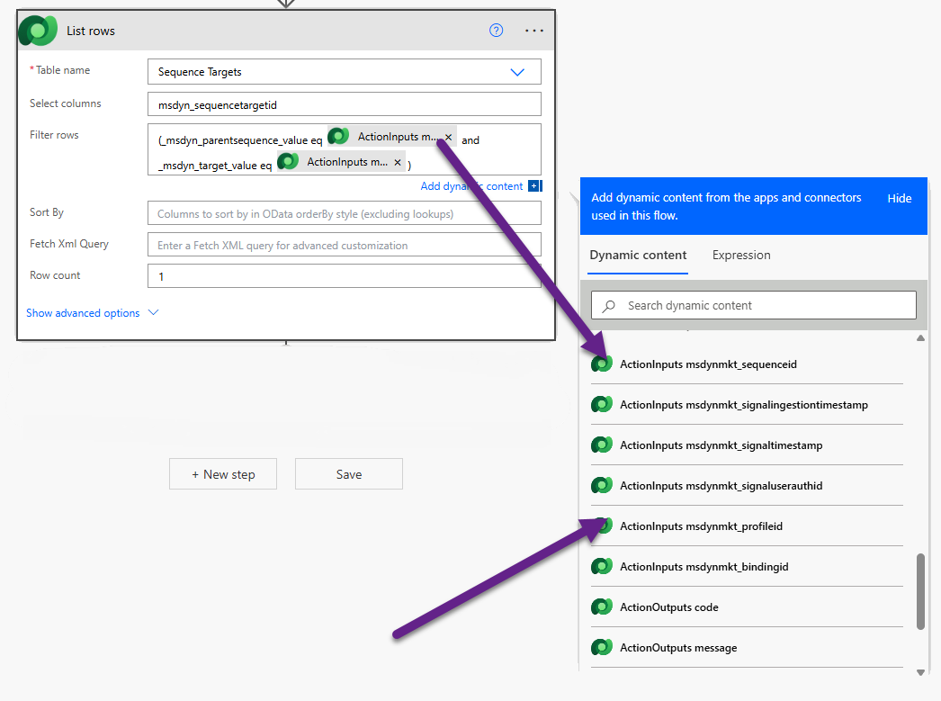 Add a List rows action step from the Dataverse connector. When we use this trigger within a Journey, we will pass through the ID of the sequence that we want to take someone out of. We will then get that from the start of our flow. Use msdyn_sequencetargetid in the select columns and then filter the rows. To do this we need to pass through the sequence id from the values from the start of the flow, and then the profile id also. This means we are finding the instance for a specific person going through a specific sequence.