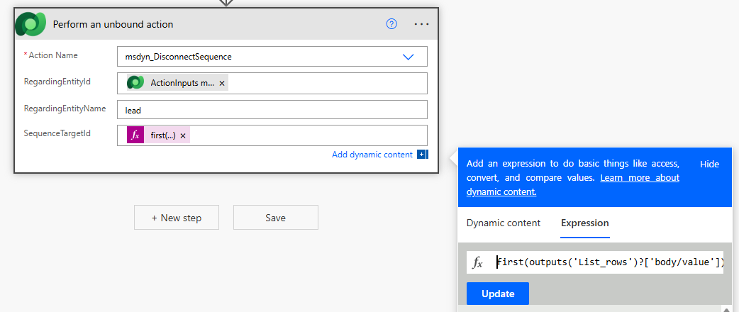 Now we need to use the Perform an unbound action from the Dataverse connector. From the action name list, pick msdyn_DisconnectSequence. The RegardingEntityId needs to be the same profileid option from the list of ActionInputs. Then the RegardingEntityName should either be lead or contact depending on what you set the trigger up for. The SequenceTargetId needs to be the first record found from the List rows step above. You can use the expression below, just rename the List_rows part if you renamed your List rows step.