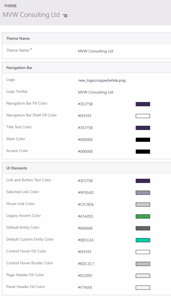 First, this is what a theme looks like. You can find them by going to a link like this, with your link in place of yourCRMlink. This will then take you to the list of all themes you have. Only one of them can be the default and determines the colours used on hyperlinks, buttons, business process flows, views etc. Each environment (PRODUCTION, UAT, DEVELOPMENT) has it’s own default so in theory could be completely different in each one. Even better to set the colours dynamically in your custom page!