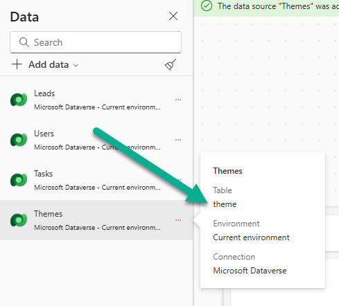 To access that in the custom page, add in Themes to the Data panel. Make sure you pick the one named theme rather than any other possible table that could be in there (especially if you have anything custom included in your environment).