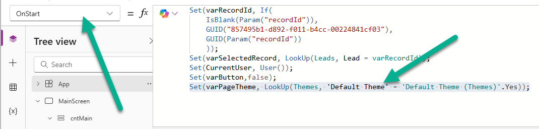 Now go to the App> OnStart formula and add in the following. This will set a variable called varPageTheme with the theme in your environment that has the Default Theme field set as Yes.