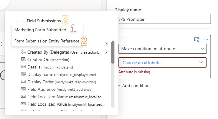 In Branch 1, I have renamed it NPS Promoter. I am going to check to see if one of the field submissions linked to the form submission has the mvw_nps field filled out and number submitted was either a 9 or a 10. To do that, it’s kind of hard to show in a screenshot, but we click to choose an attribute, then go in to the Marketing Form Submitted (1) trigger, then find the Form Submission Entity Reference (2) link, and then search for Field Submissions (3).