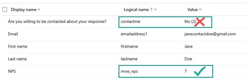 Now, what happens when a form is submitted? It creates a Form Submission record (msdynmkt_marketingformsubmission) and for each field there is a corresponding Field Submission (msdynmkt_marketingfieldsubmission) record. So a many field submission record to form submission ratio (many to one). You can see my two examples below. Here we can see the logical name and also the value. If we want to do an attribute check on these, it is fine to use the values where it is text or number but when we have radio buttons, optionsets or checkboxes, these show the word and then the actual value that was submitted.
