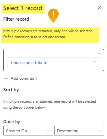 This is why we need to do something more. It clearly states, if multiple records are returned, only one will be selected. As stated at the start of this post, we have multiple field submissions to on form submission. It’s unlikely that the field we want would be returned. For example, form is submitted, if we then do a check on the logical name and value of a field submission but the field for First Name was the first one brought back, the condition would never be met, even if the form DOES have a field submission for the NPS field. But that’s OK, we can add a condition on the filter too. It feels like extra work, but it’s a condition on the match and a condition on the filter to make sure we get the right record. C’est la vie.