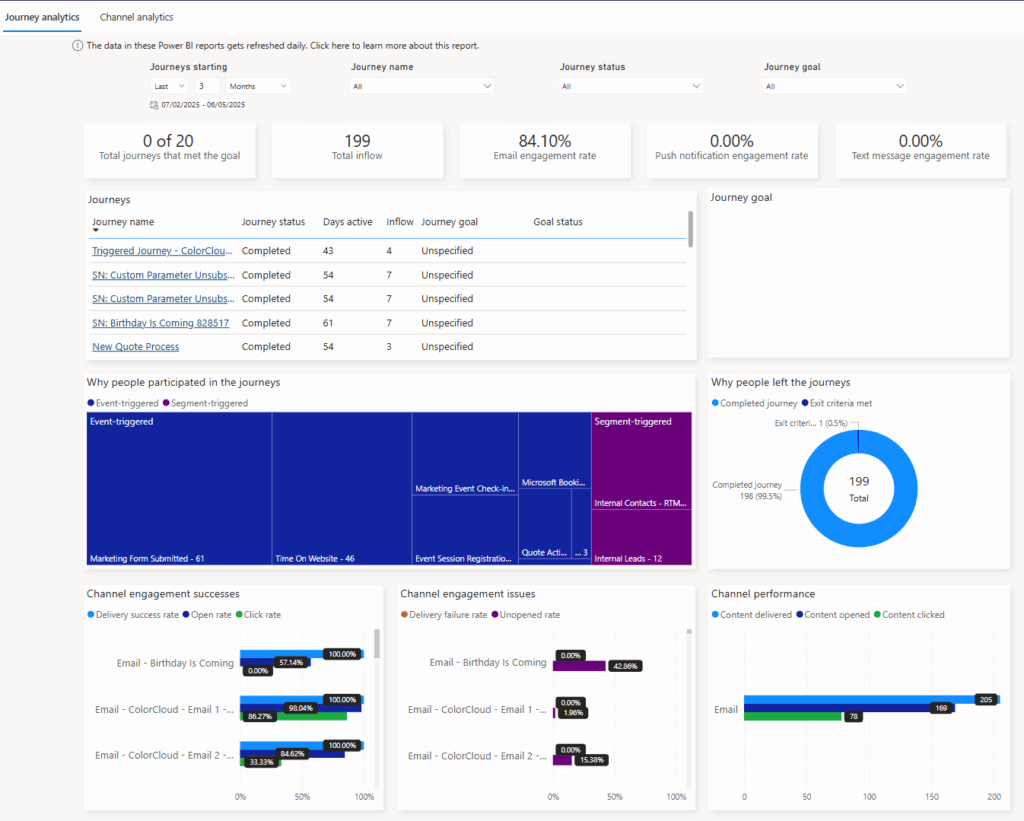 First off, we have the Analytics section in the Realtime area. There are currently two reports that are essentially Power BI reports embedded in to the marketing app. You’ve got the Journey analytics and Channel analytics. Personally, these don’t really do much for me and I’ve typically found that they are not of much interest or value to my clients. Instead, if you want to have truly custom reporting, I would suggest working with someone to get some nice reports written using the Fabric integration. You can find out more here.