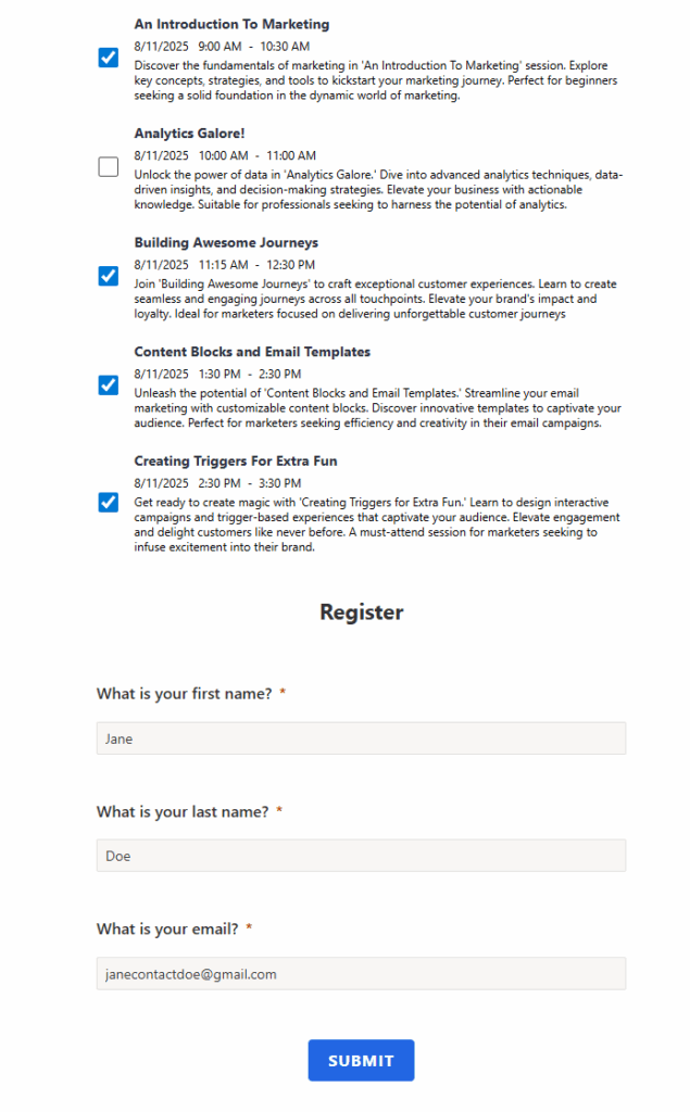 This is what the form looks like out of the box. We’ve got the sessions at the top, then the registration fields at the bottom. All a bit bland right now.