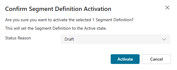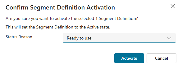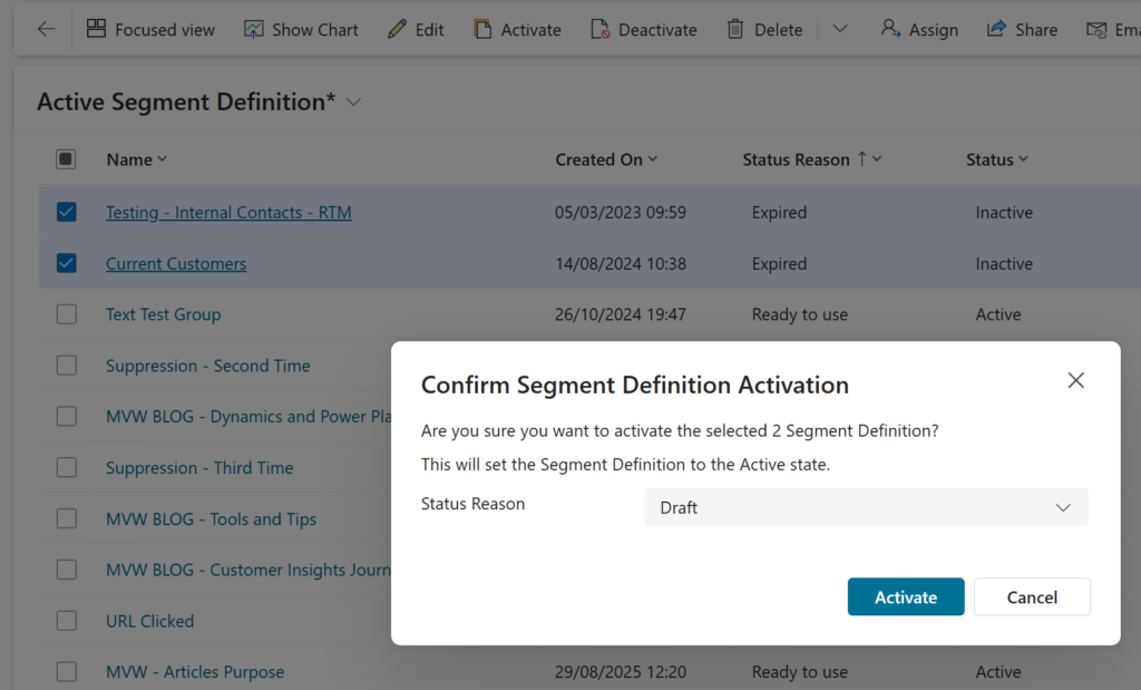 So how do we get it back so we can use it? Open up the Segment and click the Activate option from the top right. Most people (understandably so) are going to select the Status Reason of Ready to use, then click Activate.