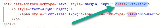 After adding the CSS at the top in the <style> section, you need to add that as a class to the DIV wrapped around your view in browser link. It should be pretty easy to find by doing a Ctrl+F to search through the code and look for ViewInBrowser. Then simply add in class=”vib-link” to that div like you see below.