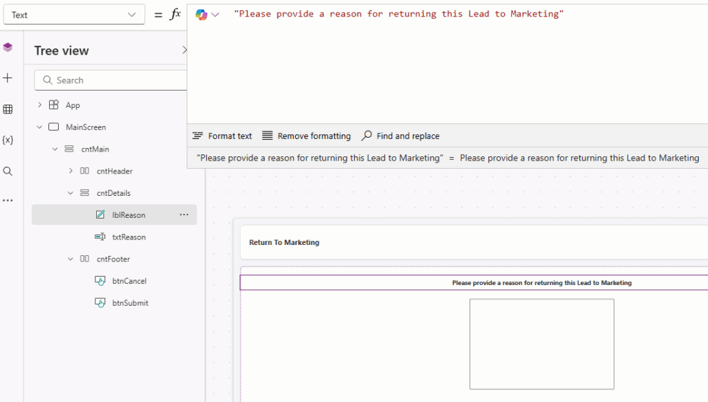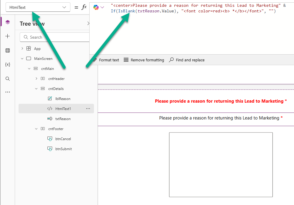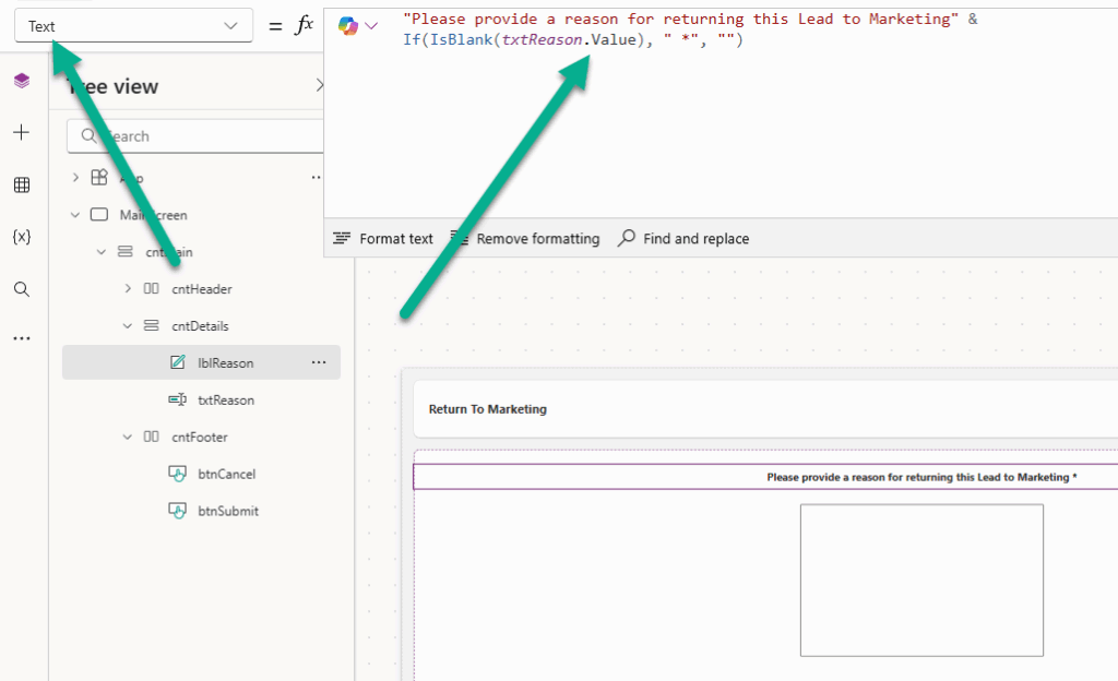 Now that takes care of them not being able to submit without anything in that value, but it would be good to indicate that on the label too in some way. There are a couple of options I will show, with the last being my preferred, but this gives you choices. First we can add a formula to the Text itself. Right after the label text closed quote, we can add the & symbol then have a formula that adds an asterisk if the txtReason.Value (the text box) is blank/empty. If not, there is no asterisk added. Better!