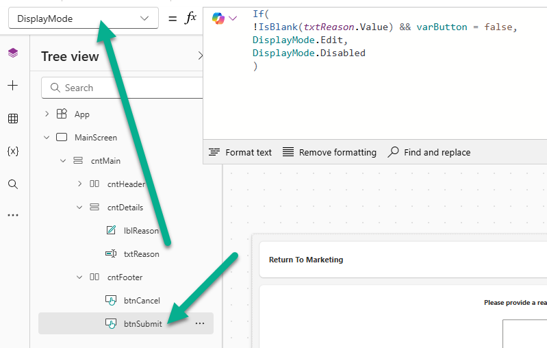 If( !IsBlank(txtReason.Value) && varButton = false, DisplayMode.Edit, DisplayMode.Disabled )