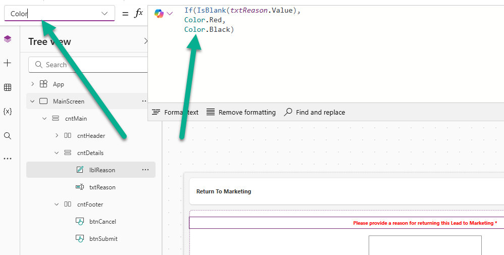 What about a colour change too? No one likes their work marked in red so let’s show it in red if the txtReason.Value is blank and if there is a value the label will be in black. Add this formula to the Color property.